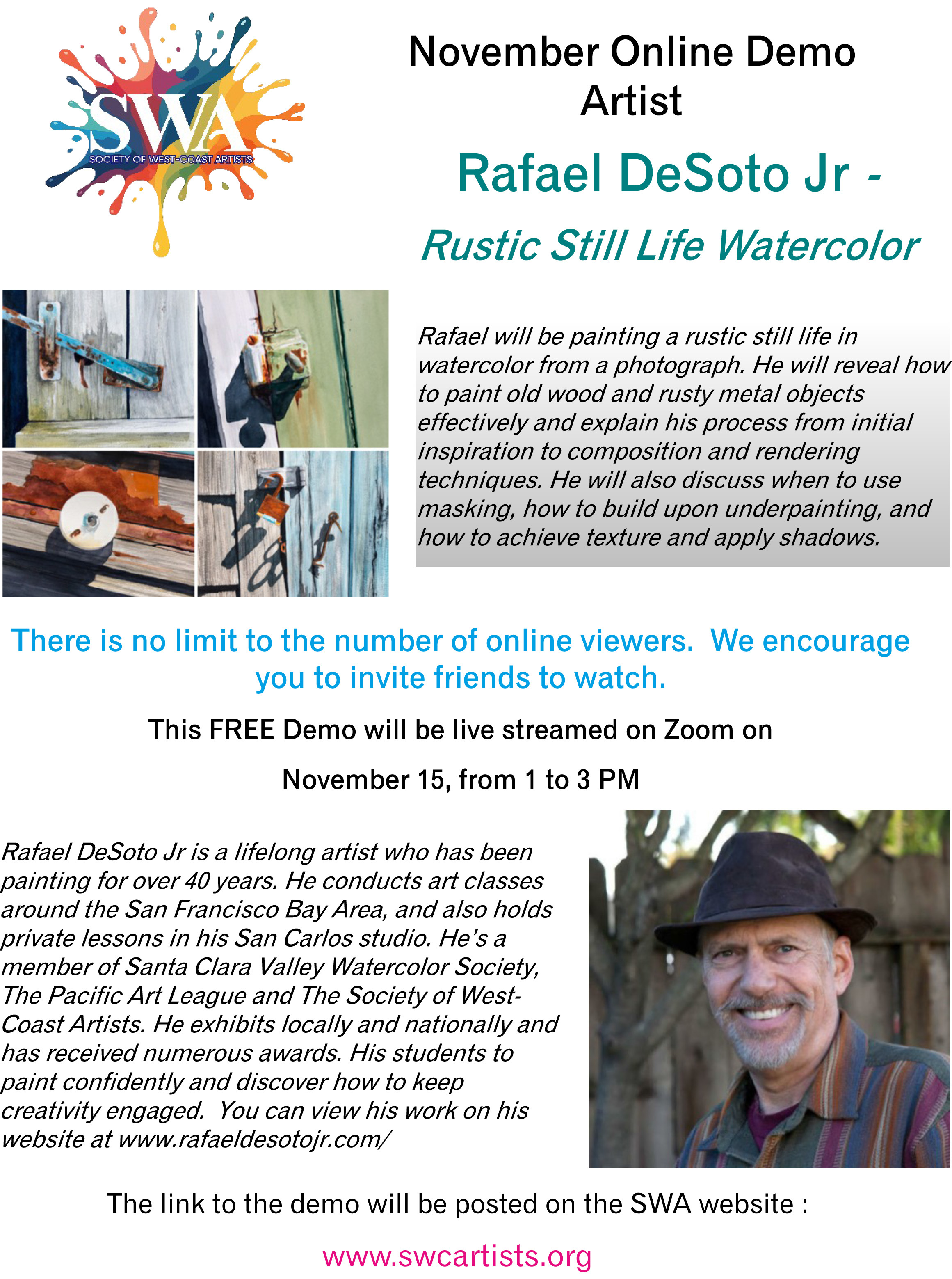 We hold free Demonstrations from January to November by well-known artists are held on a variety of subjects on the 3rd Saturday of the month from 1:00-3:00 p.m. in our Fine Art Gallery in San Bruno that is open to the public. The demonstration is also available to watch by Zoom and can be viewed later on our YouTube channel, if you missed it. Zoom link will be posted on each event. We urge you to drop in, meet some other artists and learn what we are all about.
